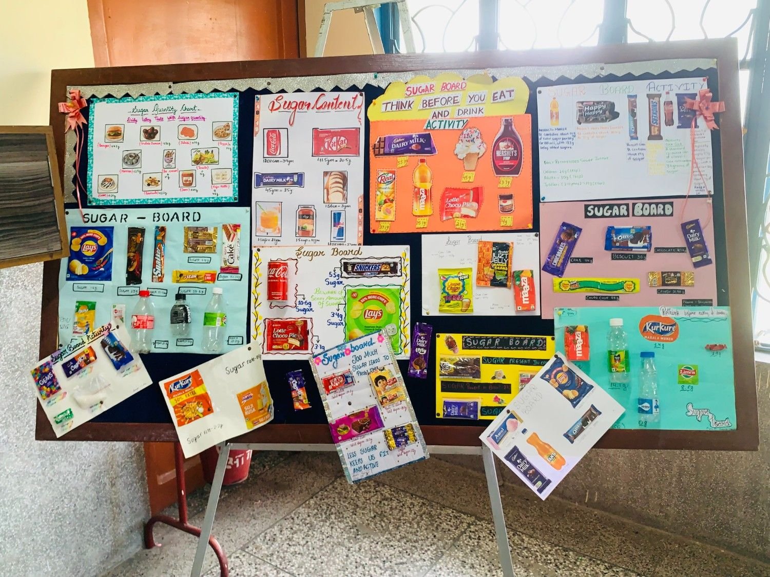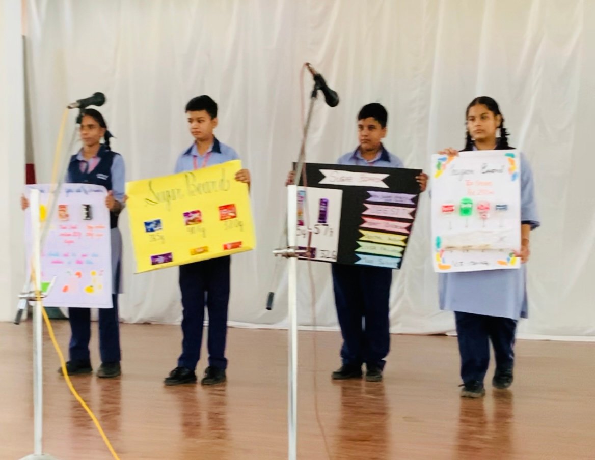Students presented creative Sugar Boards highlighting the high sugar content found in common snacks and drinks. The boards were displayed on all floors of the school to remind students how too much sugar can lead to serious health issues such as obesity, tooth decay, diabetes, and lack of concentration.